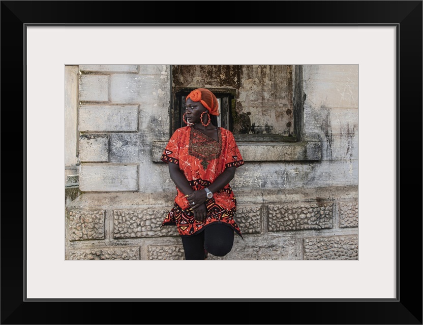 <p>Woman Stands By Old Building With Traditional Orange African Dress, Takoradi, Ghana</p>