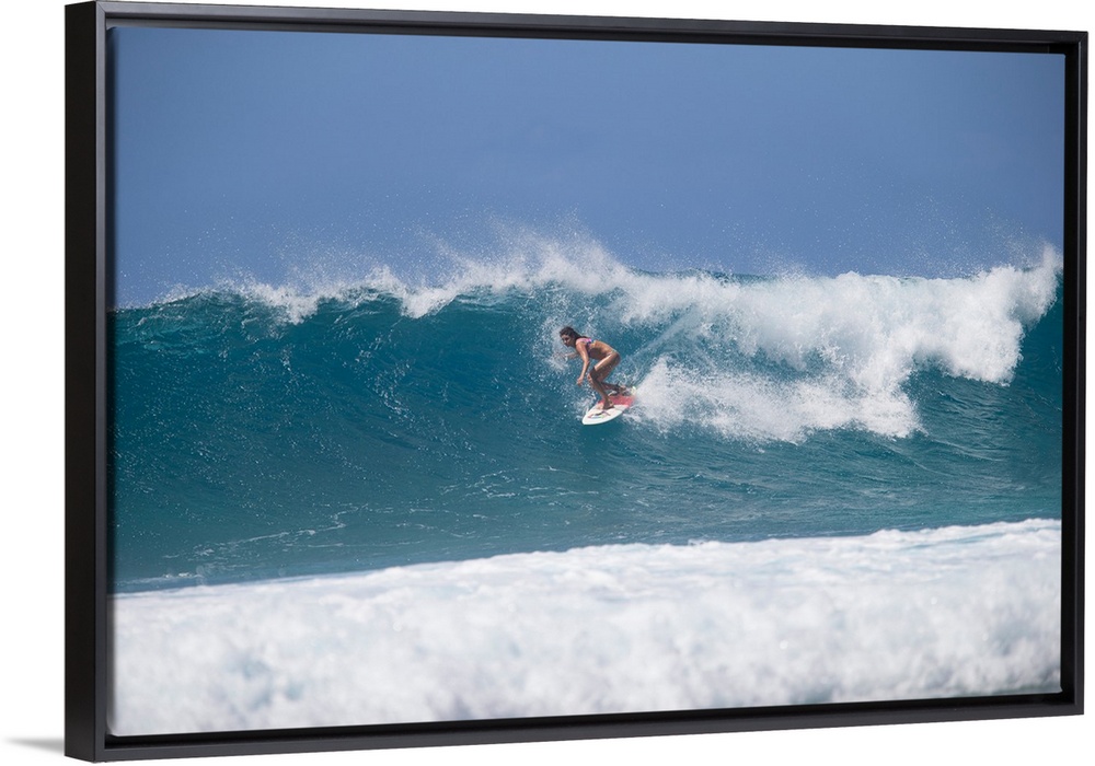 <p>Woman surfing down a wave on beach, Hawaii, USA</p>
