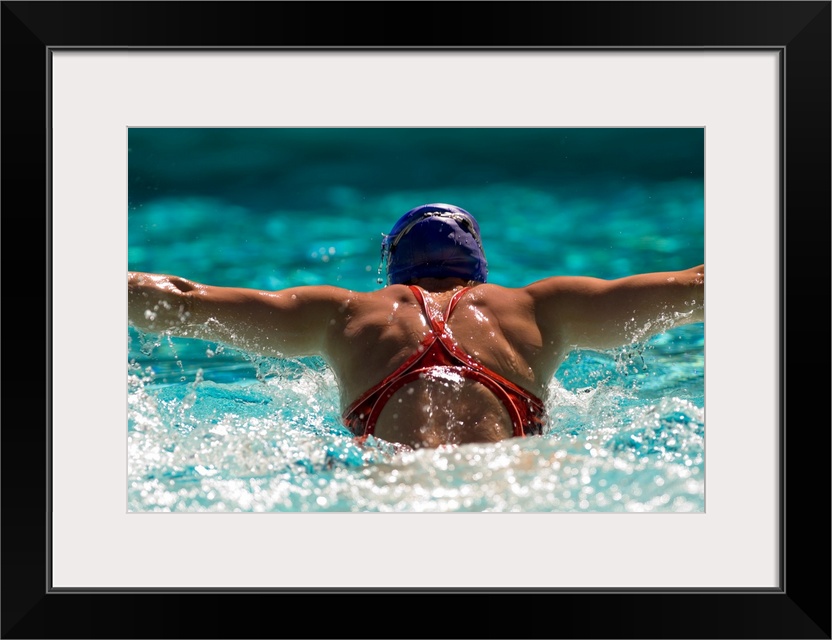 <p>Rear view of a woman swimming the butterfly stroke in a swimming pool, bainbridge island, washington state, USA.</p>