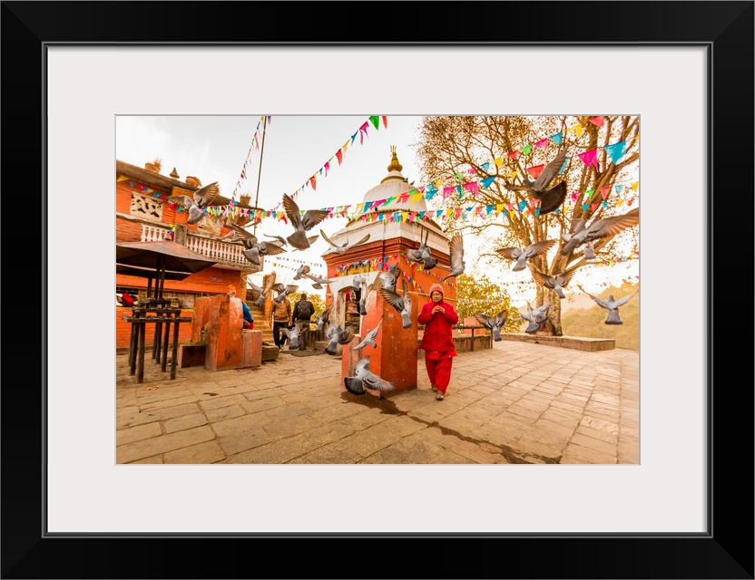 <p>Woman walking and praying with pigeons at the hilltop temple, Bhaktapur, Kathmandu Valley, Nepal</p>