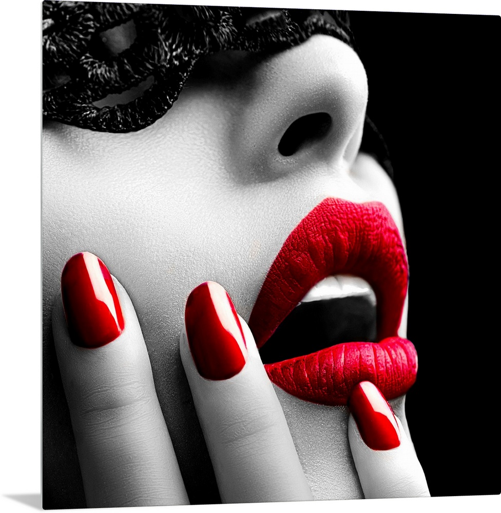 <p>Beautiful Woman with Black Lace mask over her Eyes. Red Sexy Lips and Nails closeup. Open Mouth. Man</p>