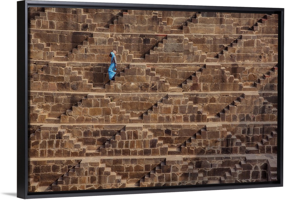 <p>Woman with blue Sari walking to get water in the Chand Baori Step Well in India.</p>