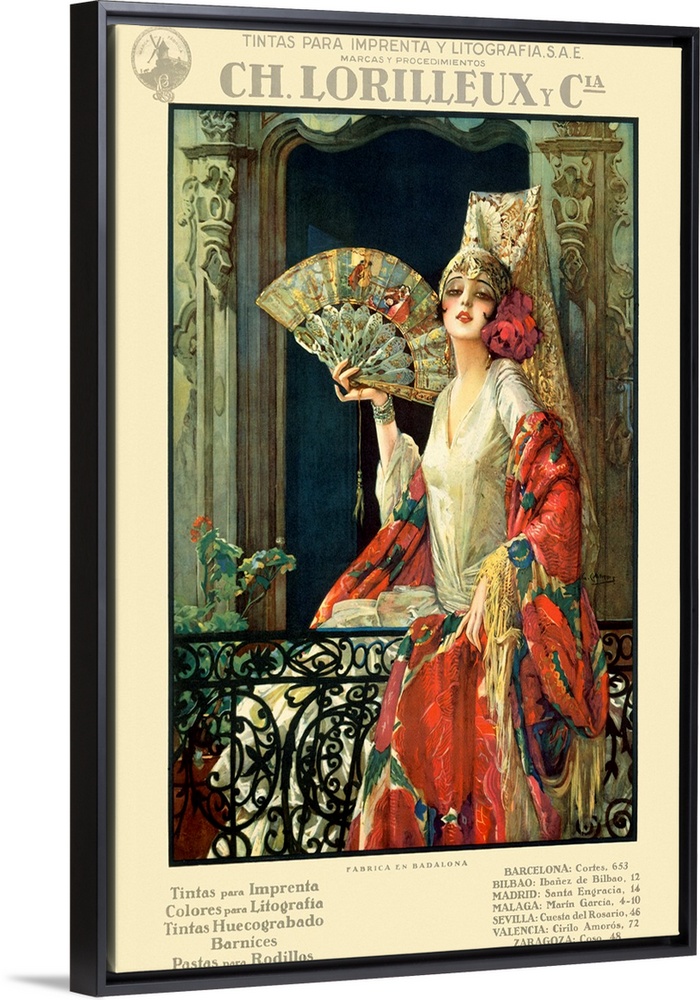 <p>Vertical, vintage artwork on a big canvas of a woman holding a detailed fan while seated, dressed in a white dress with a floral shawl flowing over the edge of an iron balcony. A large border surrounds the image with French text on the top and bottom.</p>
