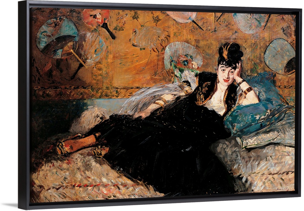 <p>Woman with Fans (Nina de Callias), by Edouard Manet, 1873 - 1874 about, 19th Century, oil on canvas, cm 113,5 x 166,5 - France, Ile de France, Paris, Muse dOrsay, RF2850. All. Gentlewoman fan Nina de Callias lying interior room dress black fan bracelet pi</p>