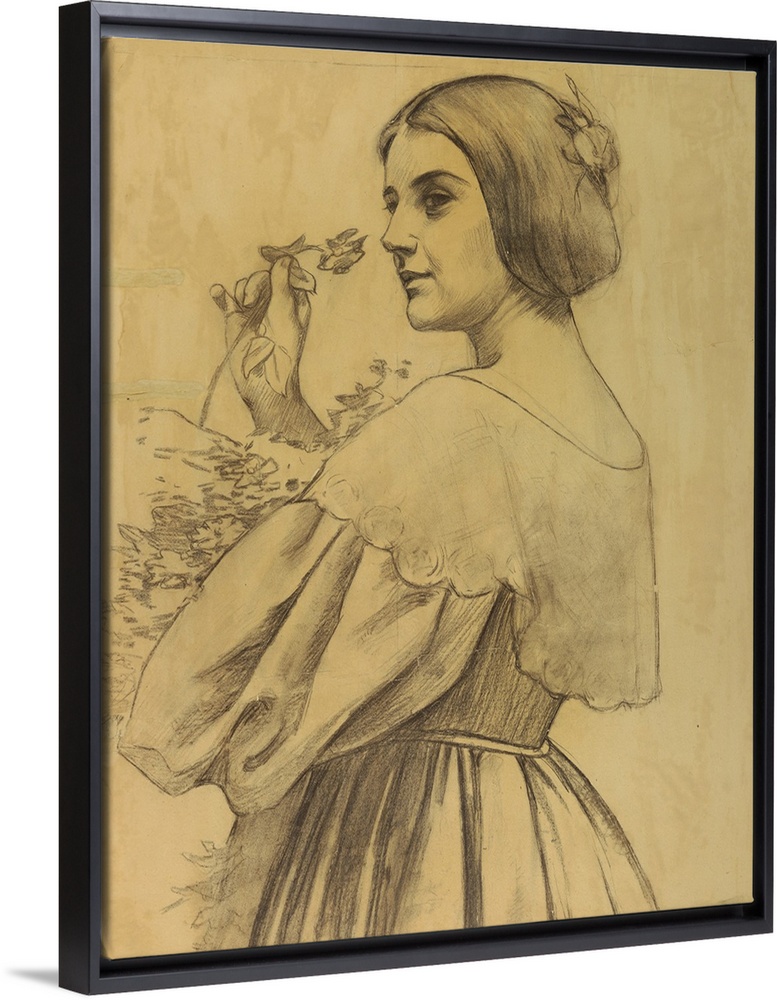<p>Half-length figure, turned away from viewer. A woman looks over her left shoulder, holding a flower in her right hand. Her left arm cradles a bouquet. Originally charcoal on paper. Drawing of female and flora.</p>