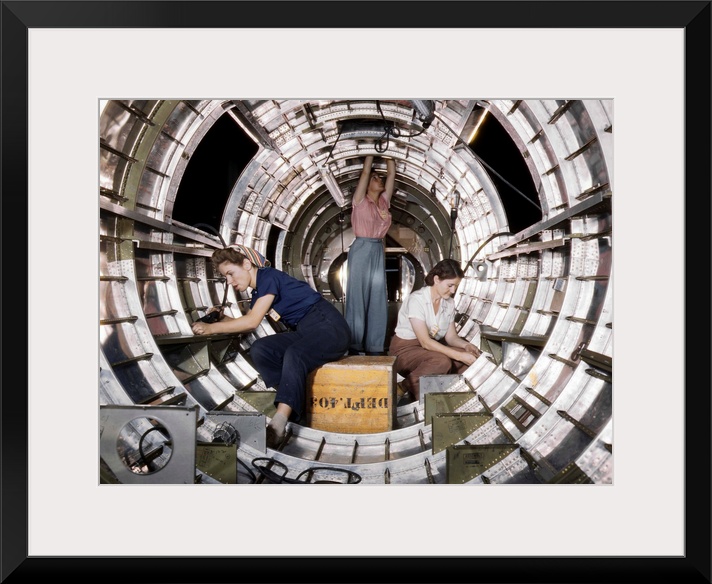 <p>Woman working on a B-17 bomber at the Douglas Aircraft plant in Long Beach, California. Photograph by Alfred T. Palmer, June 1942.</p>