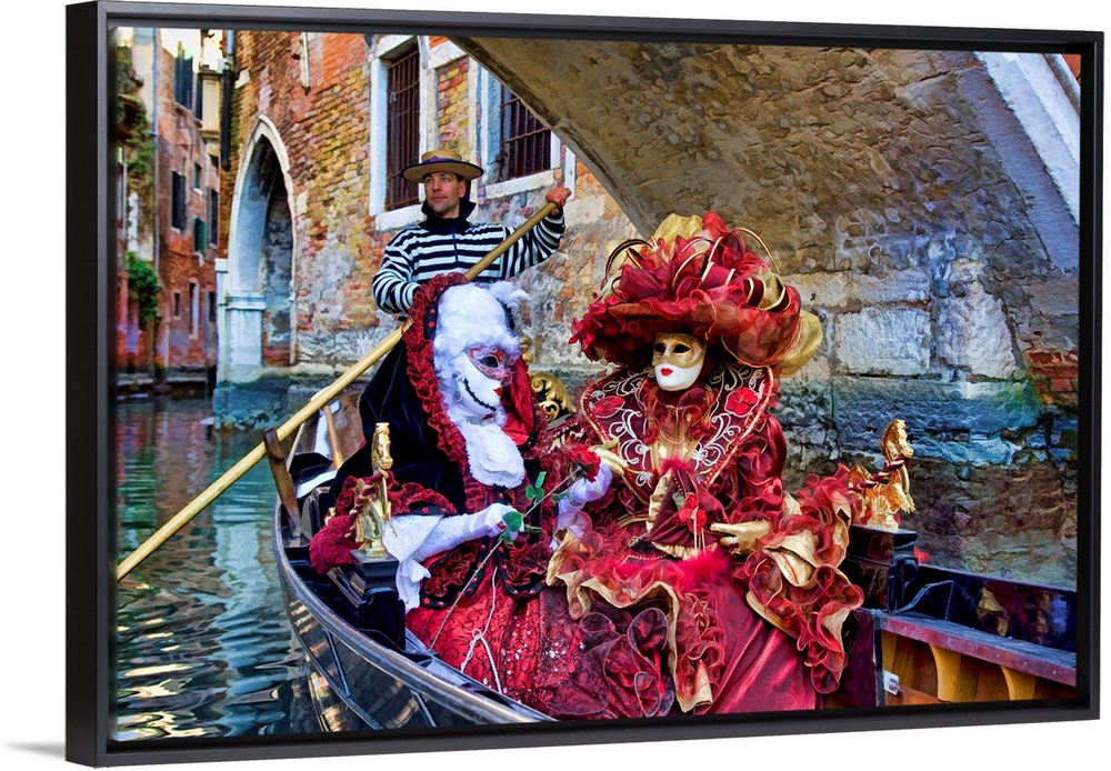 <p>Women in masquerade outfits on a gondola at Carnival in Venice, Italy</p>