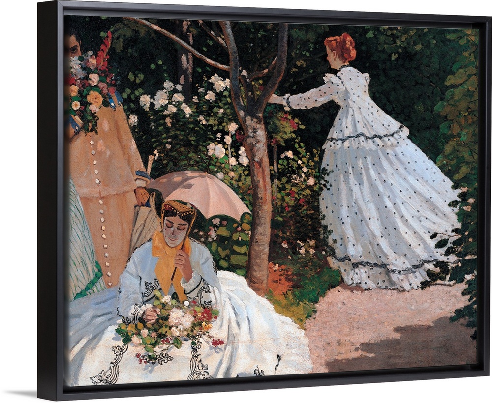 <p>Women in the Garden, by Claude Monet, 1866 - 1867, 19th Century, oil on canvas, cm 255 x 205 - France, Ile de France, Paris, Muse dOrsay, RF 2773. Detail. Women garden tree light blue azure white pink green grass path rose umbrella skirt dress. (246669) E</p>