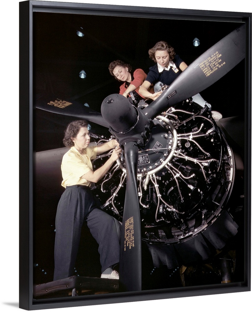 <p>Women installing an aircraft engine at the Douglas Aircraft plant in Long Beach, California. Photograph by Alfred T. Palmer, June 1942</p>