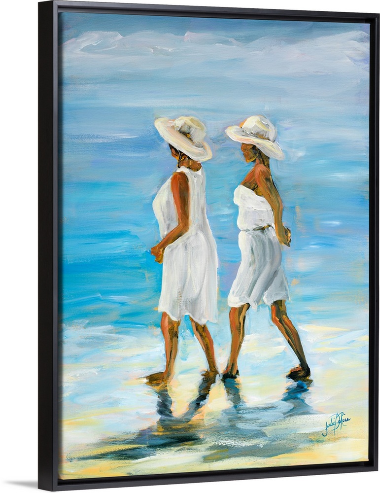 <p>Painting of two women in white walking along the water's edge.</p>