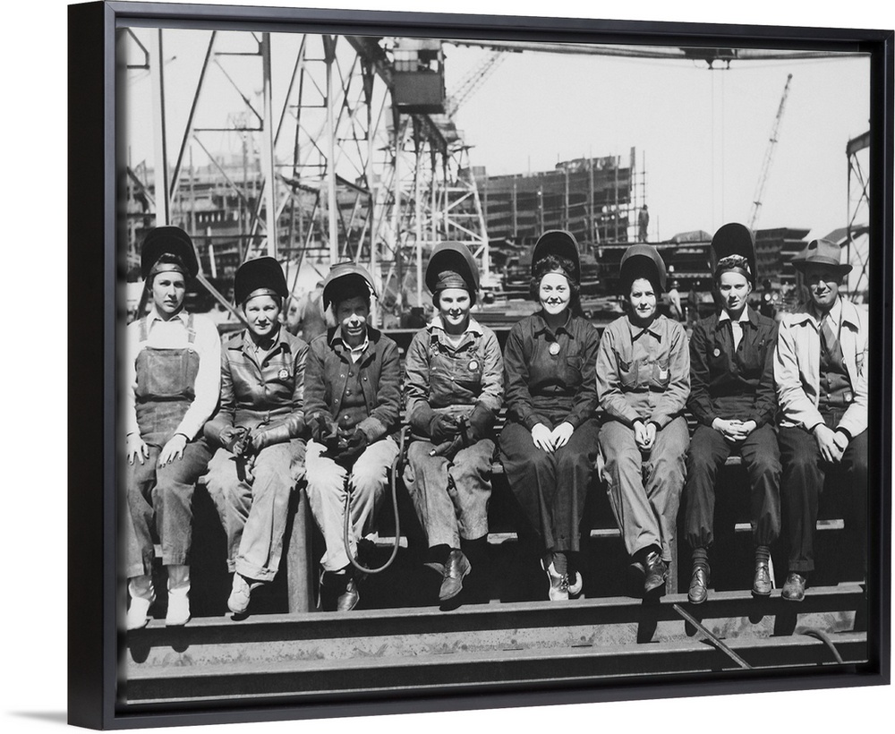 <p>Women welders wearing protective clothing and seated outdoors, 1943.</p>