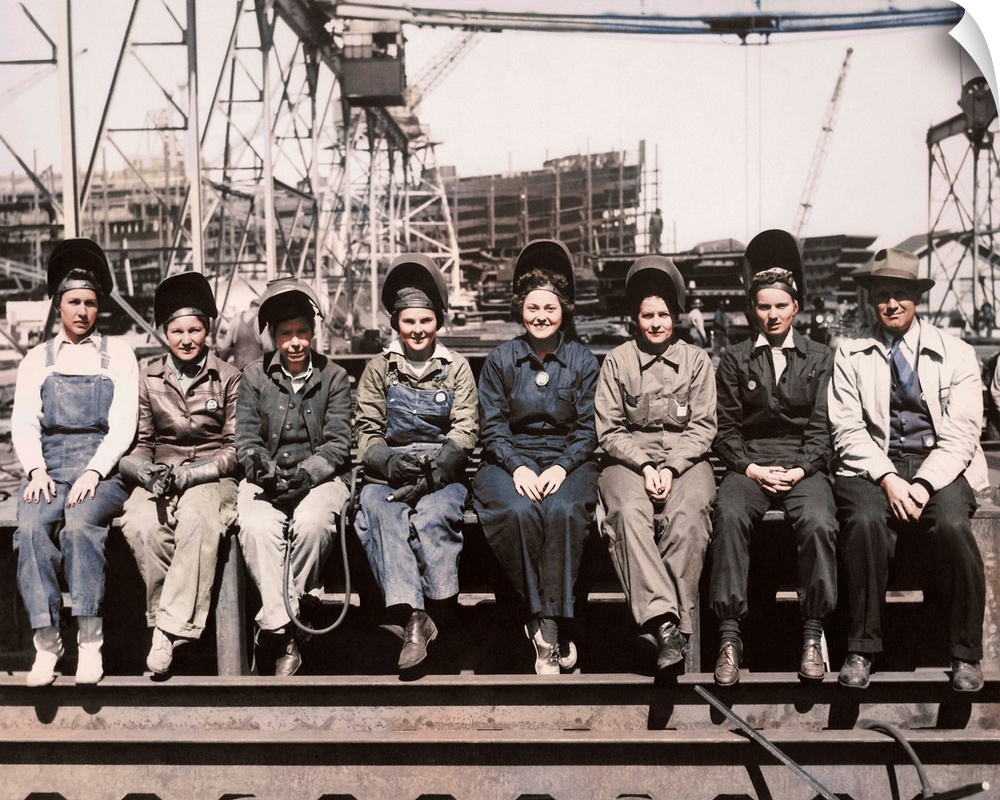 <p>Women welders wearing protective clothing and seated outdoors.</p>