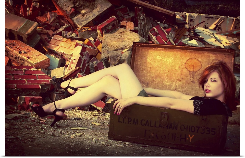 <p>A young woman wearing a short skirt sitting in a suitcase</p>