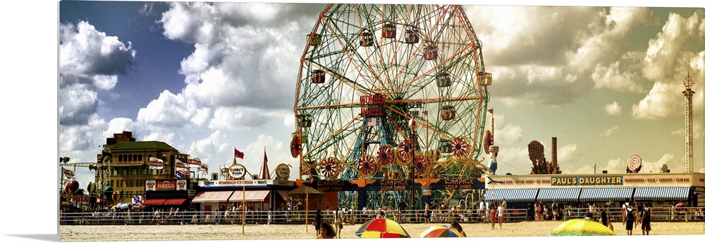 <p>Panoramic photo of the large ferris wheel at Coney Island theme park in New York.</p>