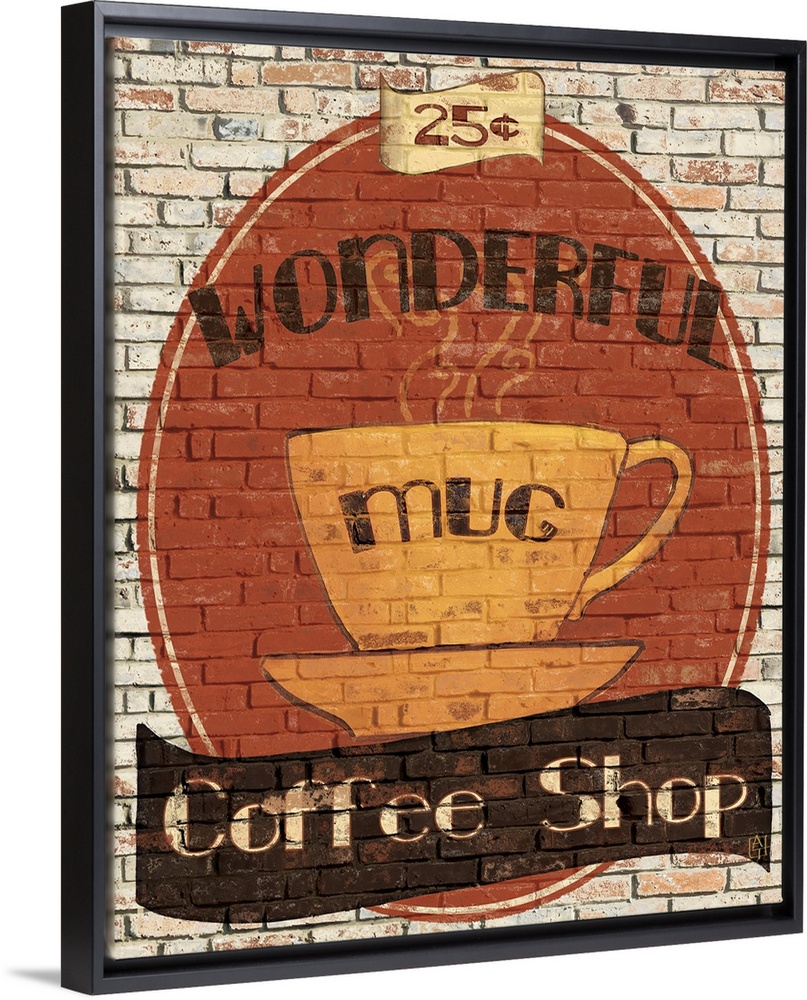 <p>Digital art that depicts an old type coffee shop ad on the side of the brick building with a coffee mug with steaming coffee in it for only 25 cents.</p>