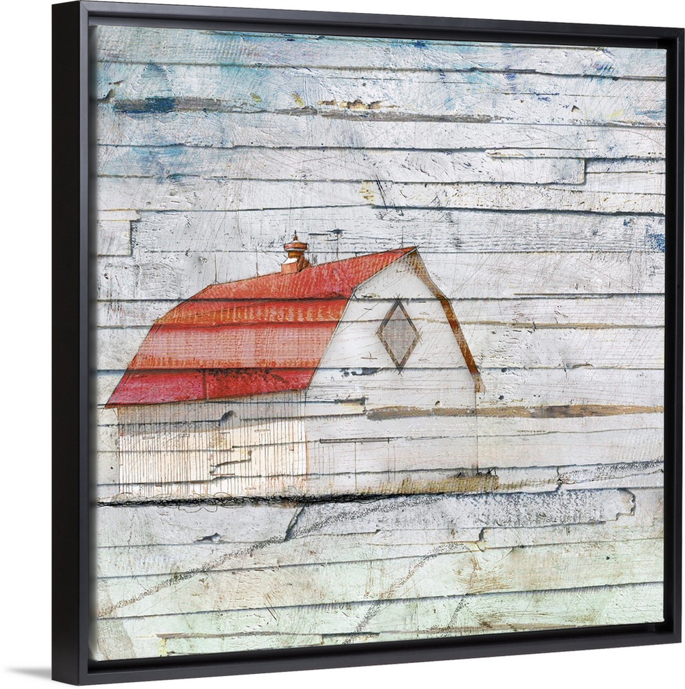 <p>Painting of a white barn with a red roof on rustic, distressed wood panels.</p>