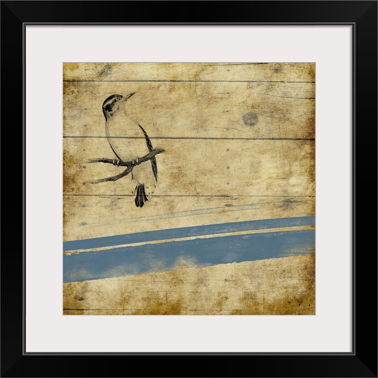 <p>Contemporary piece of art depicting a bird perched on a branch against a rustic wooden background</p>
