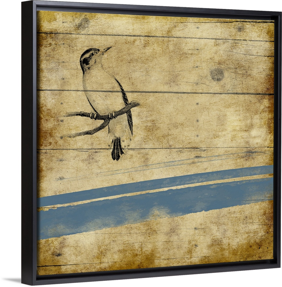 <p>Contemporary piece of art depicting a bird perched on a branch against a rustic wooden background</p>