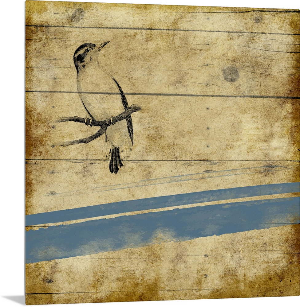 <p>Contemporary piece of art depicting a bird perched on a branch against a rustic wooden background</p>