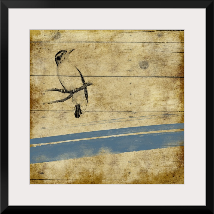 <p>Contemporary piece of art depicting a bird perched on a branch against a rustic wooden background</p>