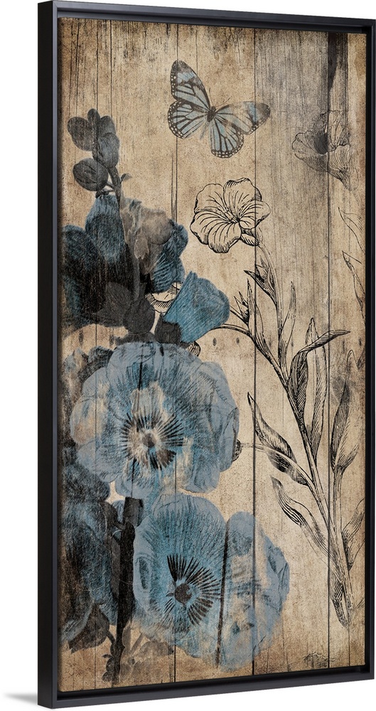 <p>Vertical contemporary artwork of blue flowers appearing to be painted on a wood surface.</p>