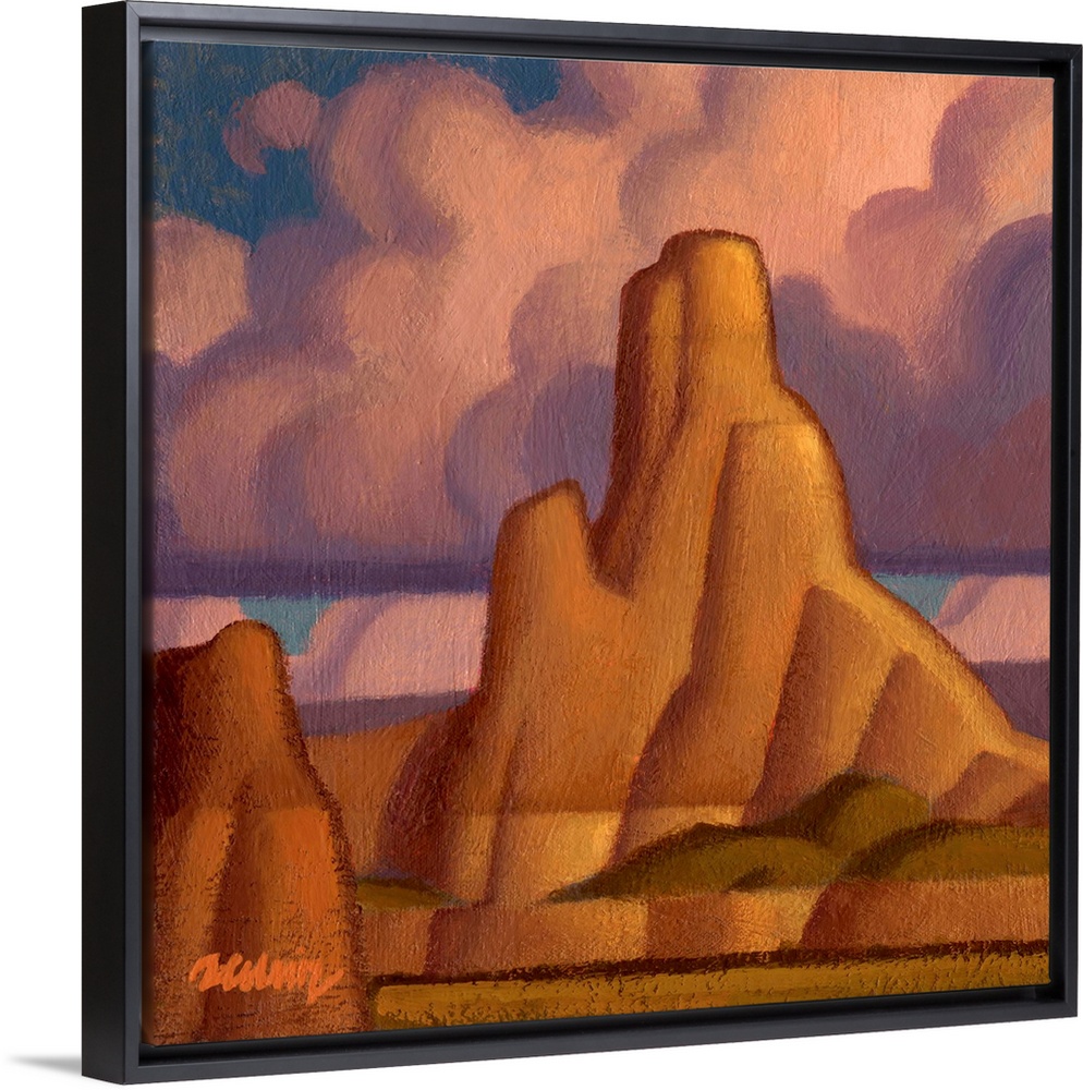 <p>Square landscape painting of large canyons with pink fluffy clouds above.</p>