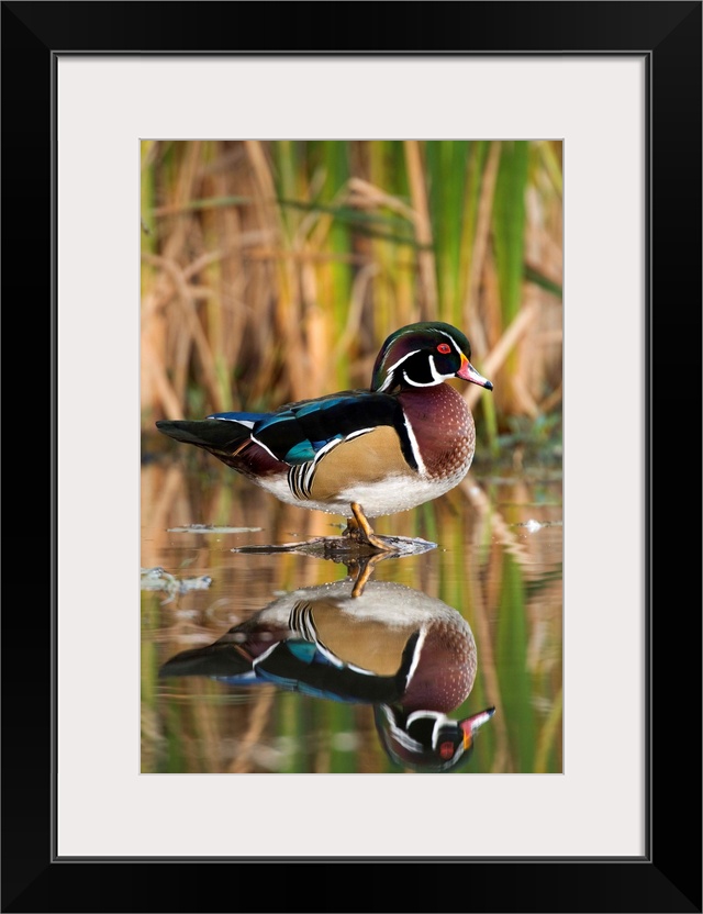 <p>wood duck (Aix sponsa), Reflection, Standing, Male, Lapeer State Game Area, MI</p>