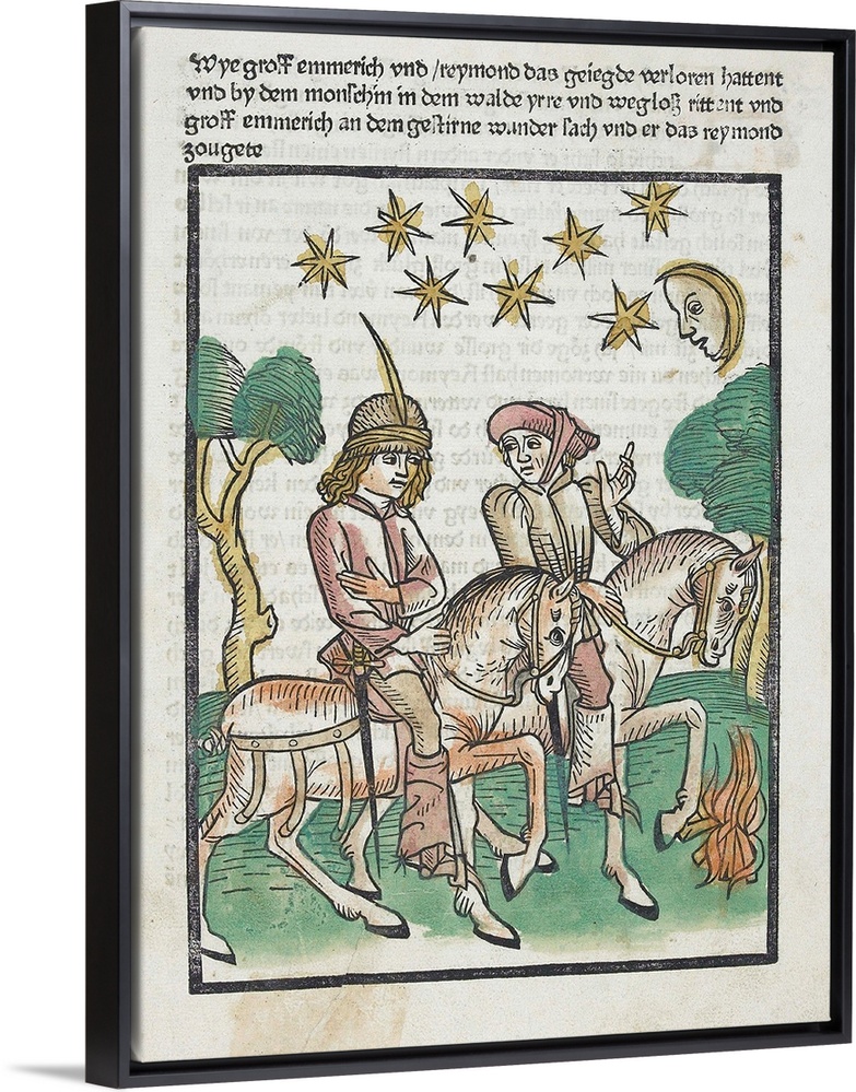 <p>Illustration of two men travelling by horseback at night, from a German version of the medieval French romance Le Roman de Melusine' (The Romance of Melusine') by the court writer Couldrette. Written mid-14th century, and telling the tale of the fair Melusine and her founding of a family dynasty. Book printed in Basel, c. 1476. Woodcut from a private collection.</p>
