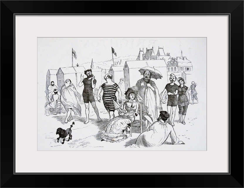 <p>Woodcut illustration of French and English people relaxing on the beach. Dated 1889.</p>