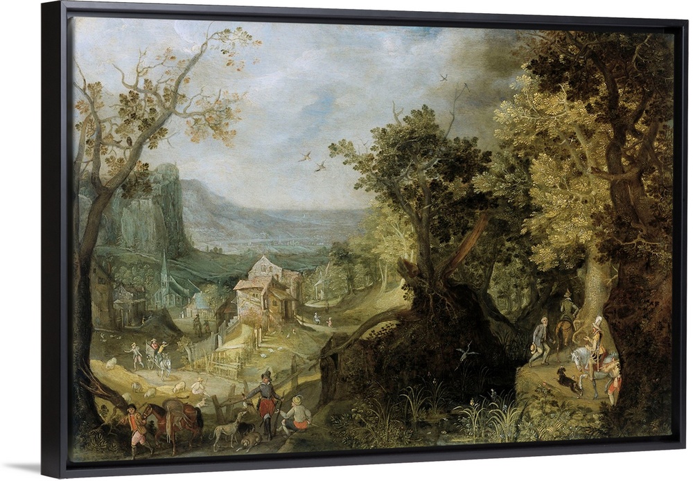 <p>Wooded Landscape, by Anton Mirou, 1608, Flemish painting, oil on canvas. Mountainous landscape with riders and walkers on a path through a forest at right, and hunters at lower left. In the mid-ground is a village, with houses and more human activity.</p>