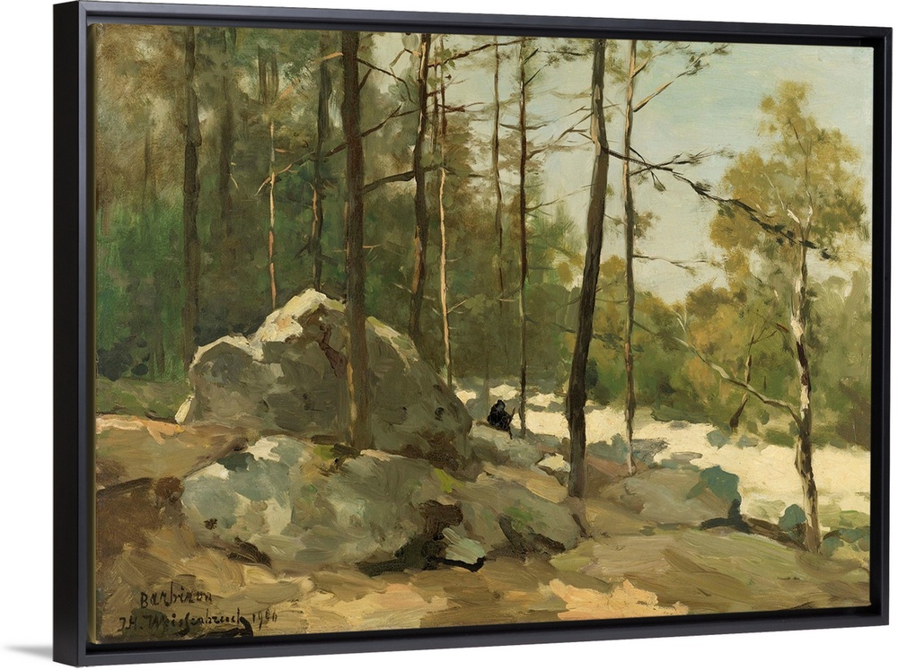 <p>Wooded View near Barbizon, by Johan Hendrik Weissenbruch, 1900, Dutch painting, oil on canvas. A painter on a boulder sketching forest. Barbizon artists' colony of 19th c. French realist landscape painters greatly influenced Weissenbruch and other Dutch artists of the Hague school.</p>