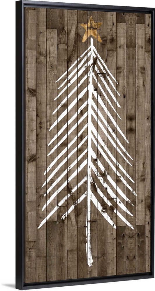 <p>A decorative design of a simple Christmas tree in white with gold accents on a wood backdrop.</p>