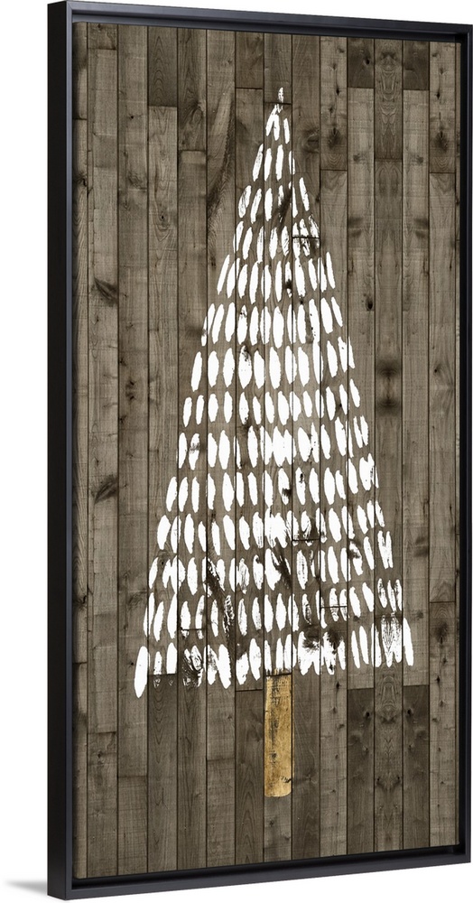 <p>A decorative design of a simple Christmas tree in white with gold accents on a wood backdrop.</p>