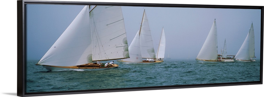<p>Panoramic photograph of sailboats crossing the ocean on a clear day.</p>