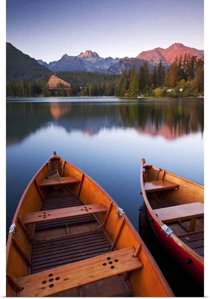 <p>Wooden boats on Strbske Pleso lake in the Tatra Mountains of Slovakia, Europe. Autumn</p>