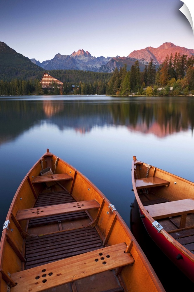 <p>Wooden boats on Strbske Pleso lake in the Tatra Mountains of Slovakia, Europe. Autumn</p>