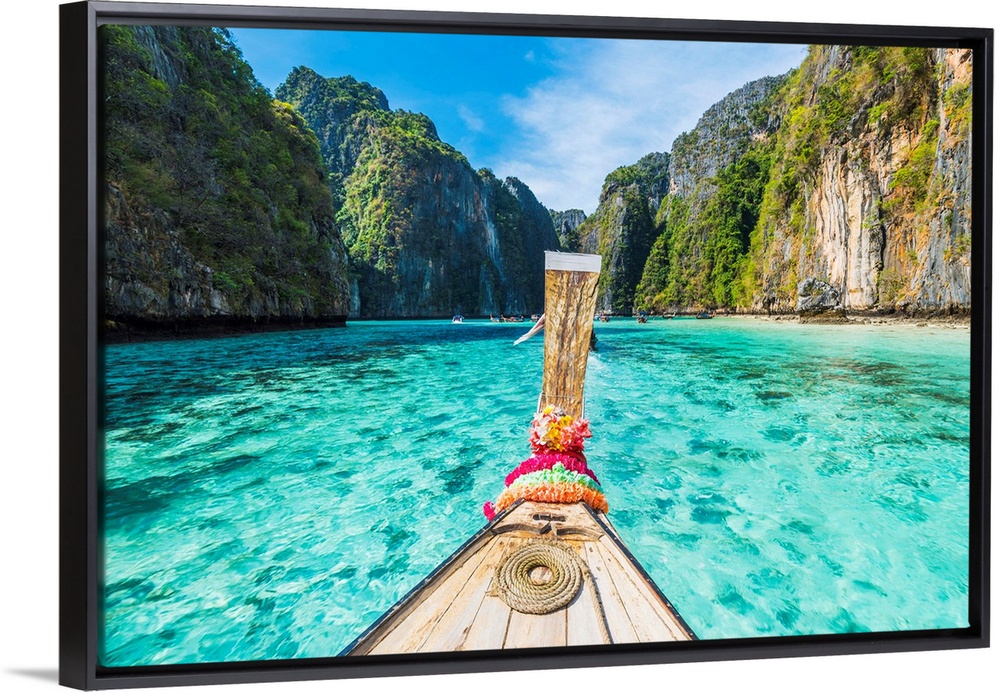 <p>Ao Pileh (Pileh Lagoon), Ko Phi Phi Leh, Krabi Province, Thailand. Wooden Bow Of A Long Tail Boat In Turquoise Waters.</p>