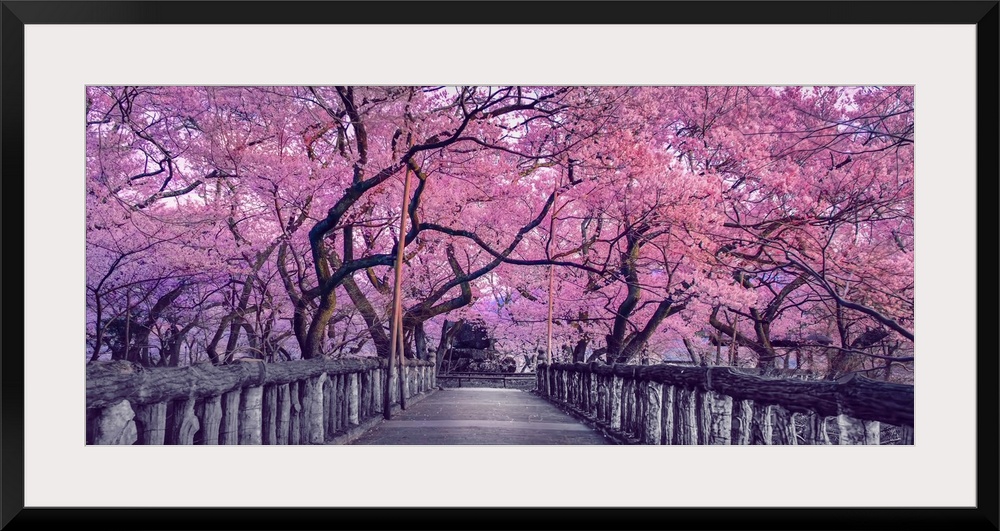 <p>Beautiful pink cherry trees blooming extravagantly at the end of a wooden bridge in park, japan, spring scenery of Japanese countryside with amazing sakura (cherry) blossoms.</p>