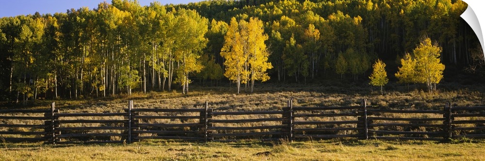 <p>Colorful trees are pictured behind a small wooden fence in panoramic view.</p>