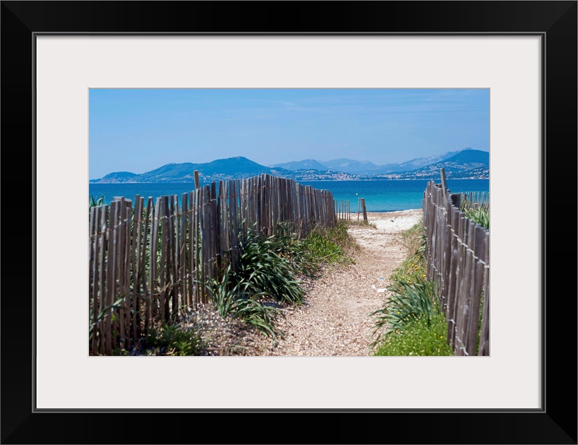 <p>Wooden fences (ganivelles) on both sides of the pathway that leads to the Almanarre Beach in Hyres. Sea and mediterranean coast in background .</p>
