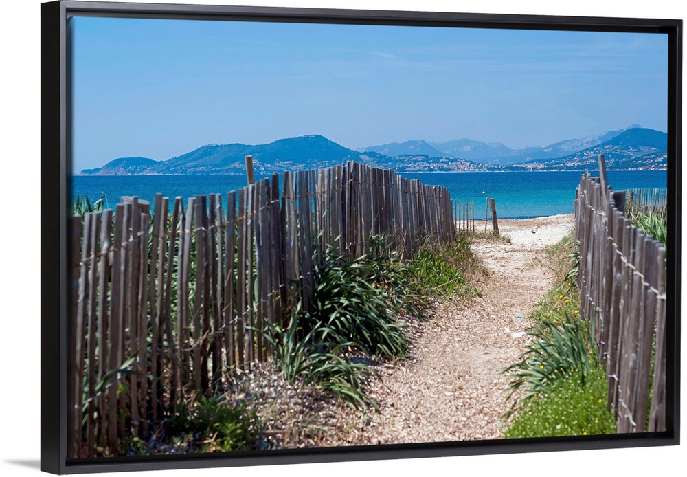 <p>Wooden fences (ganivelles) on both sides of the pathway that leads to the Almanarre Beach in Hyres. Sea and mediterranean coast in background .</p>