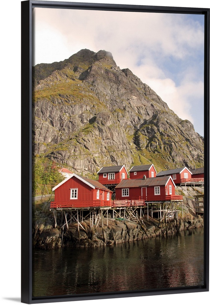 <p>Wooden fishermen's cabins on stilts, known locally as rorbu and now mostly used as tourist accommodation, in a village on Lofoten Islands, Norway.</p>