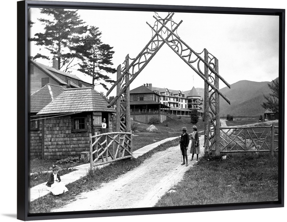 <p>A meticulously crafted wooden gate leads to the resort and hotel at Oak Mountain Reserve in New York's Adirondack Mountains. Ca. 1890. | Location: Oak Mountain Reserve Resort Hotel, Adirondack Mountains, New York, USA.</p>