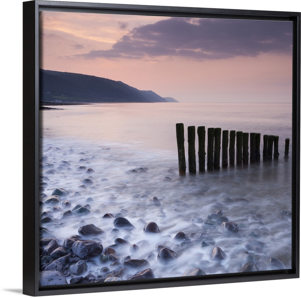 <p>Wooden groynes on Bossington Beach at sunset, Exmoor National Park, Somerset, England. Spring</p>