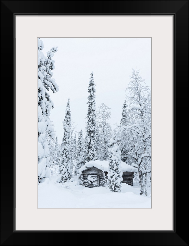 <p>Wooden hut covered with snow in the snowy forest at Pallas-Yllastunturi National Park, Akaslompolo, Muonio, Lapland, Finland</p>