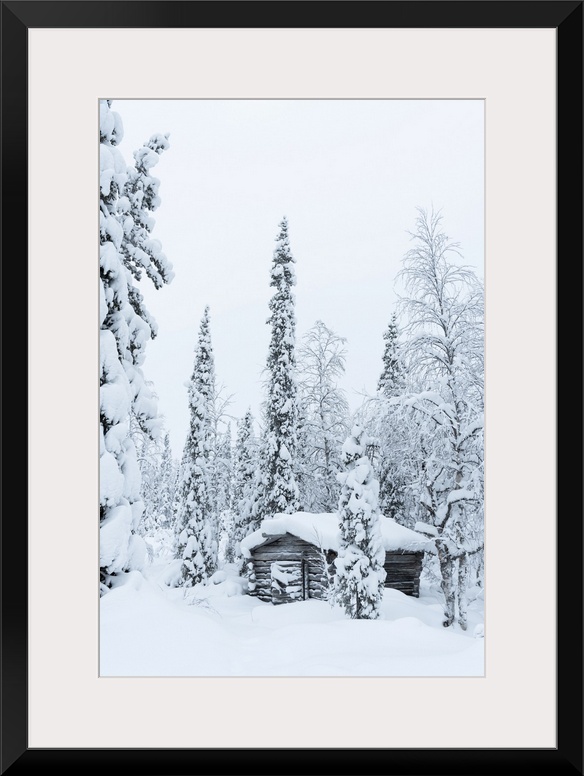 <p>Wooden hut covered with snow in the snowy forest at Pallas-Yllastunturi National Park, Akaslompolo, Muonio, Lapland, Finland</p>