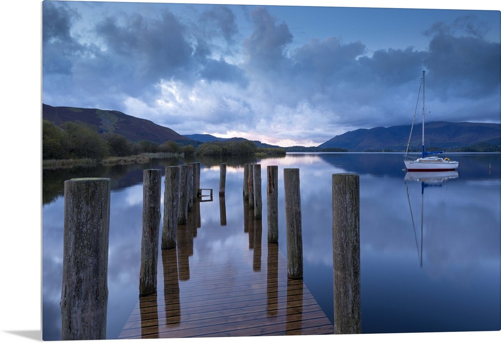 <p>Wooden jetty and yacht on Derwent Water near Lodore, Lake District, Cumbria, England. Autumn (October)</p>