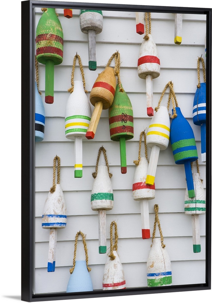 <p>Wooden lobster buoys hang on a wall in Stonington, Maine.</p>