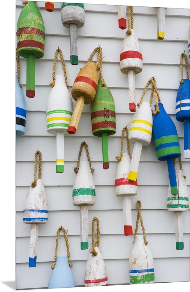 <p>Wooden lobster buoys hang on a wall in Stonington, Maine.</p>