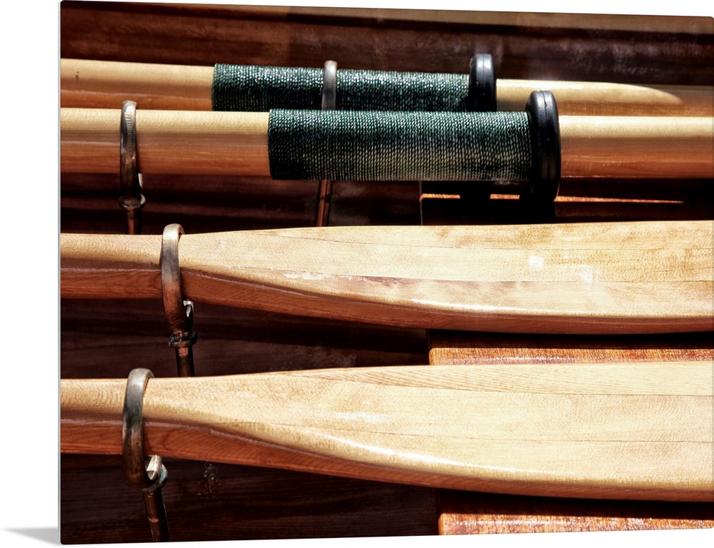 <p>Close-up photograph of wooden oars laid out on a boat.</p>